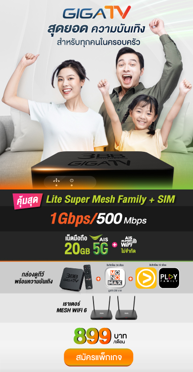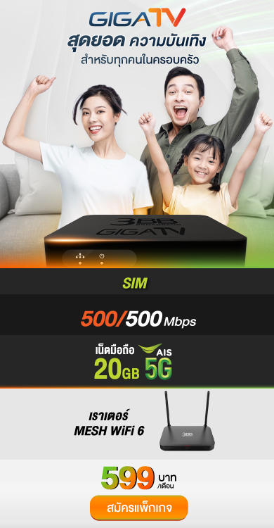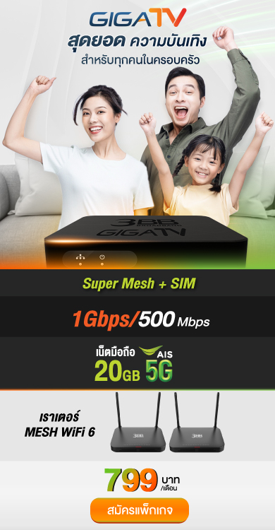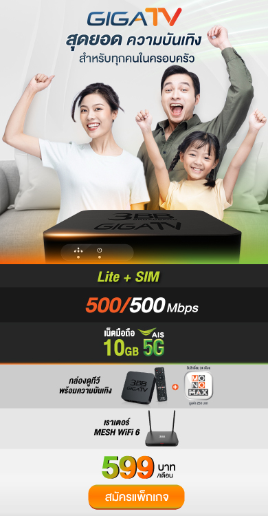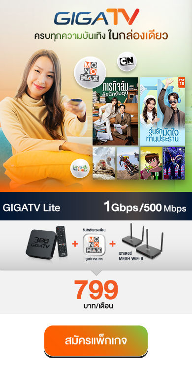 *โปรโมชั่นสัญญา 24 เดือน / ราคาไม่รวมภาษีมูลค่าเพิ่ม / อุปกรณ์ขึ้นอยู่กับประเภทแพ็กเกจและพื้นที่ให้บริการ ข้อกำหนดและเงื่อนไขบริการ | ช่องรายการที่สามารถรับชมได้ ช่อง BBC earth และ BBC Lifestyle จะยุติการออกอากาศผ่านกล่อง GIGATV ตั้งแต่วันที่ 15 มี.ค. 67 เป็นต้นไป